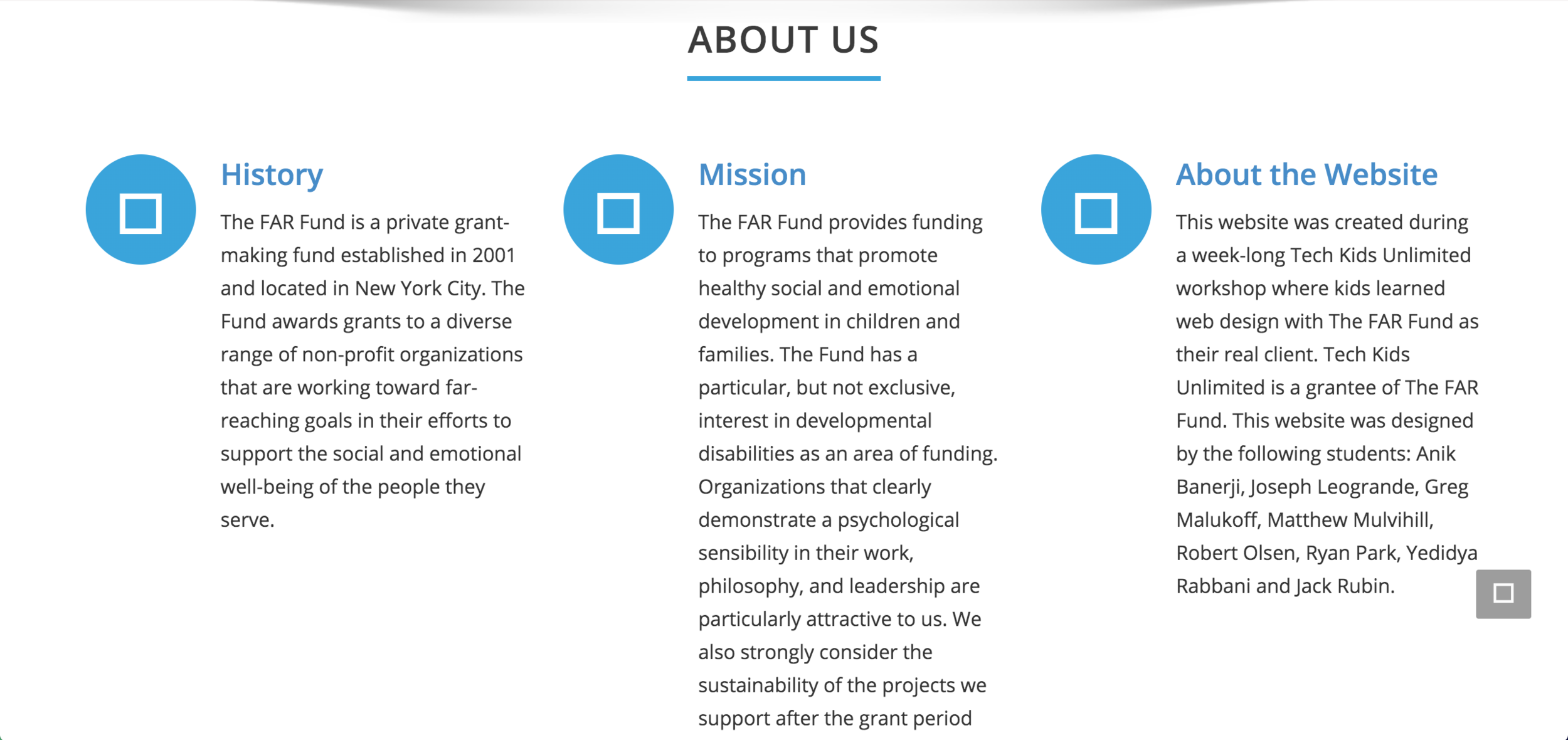 This website and logo were created by the TKU Digital Agency for The FAR Fund, a private grant-making fund established in 2001 and located in New York City. The Fund awards grants to a diverse range of non-profit organizations that are working toward far-reaching goals in their efforts to support the social and emotional well-being of the people they serve.